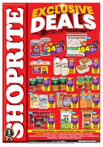www.shoprite.co.za www.shoprite.mobi follow us on OFFERS VALID FROM MONDAY 1 DECEMBER 2025 UNTIL SUNDAY 7 DECEMBER 2025 ONLY AT SHOPRITE DUTYWA, EMPUMALANGA-BUTTERWORTH, GILLWELL, KENTANI, KING WILLIAM’S TOWN, MDANTSANE, MQANDULI, NGCOBO, QUEENSTOWN, STERKSPRUIT, STUTTERHEIM AND ZIYABUYA ECFOSLDQVY/E OFFERS VALID FROM MONDAY 1 DECEMBER 2025 UNTIL SUNDAY 7 DECEMBER 2025. PRICES APPLY TO SHOPRITE DUTYWA, EMPUMALANGA-BUTTERWORTH, GILLWELL, KENTANI, KING WILLIAM’S TOWN, MDANTSANE, MQANDULI, NGCOBO, QUEENSTOWN, STERKSPRUIT, STUTTERHEIM AND ZIYABUYA. WHILE STOCKS LAST. WE RESERVE THE RIGHT TO LIMIT QUANTITIES. NO TRADERS. VAT INCLUDED. ERRORS AND OMISSIONS EXCEPTED. CUSTOMER CARE LINE 0800 01 07 09 (TOLL-FREE). CRICKLEY AMASI FULL CREAM MAAS 2l SAVE R15 2 FOR R57 FARMER’S CHOICE FROZEN CHICKEN LIVERS 250g SAVE R2 2 FOR R22 CRICKLEY NATURES SECRET FRUIT NECTAR BLEND all variants 2l SAVE R15 ANY 2 FOR R45 SAVE R50 GOLDEN DELIGHT LONG GRAIN WHITE PARBOILED THAI RICE 10kg 11999 SAVE R30 IWISA NO.1 SUPER MAIZE MEAL 10kg R100 SAVE R8 RHODES PEACH SLICES/ HALVES IN SYRUP 410g each 1999 SAVE R3 RHODES TOMATO & ONION MIX 410g each 1899 SAVE R8 SUPER WHITE INSTANT MAIZE PORRIDGE all variants 1kg each 2199 ALLSOME LONG GRAIN PARBOILED RICE 2kg SAVE R30 3 FOR R90 SAVE R5 RHODES CHAKALAKA all variants 400g each 1999 SAVE R15 18499 RAINBOW FROZEN CHICKEN LEG QUARTERS 3,5kg SAVE R14 RITEBRAND FRENCH POLONY 2kg 5599 10kg 10kg 2kg 2kg 2l 2l 1kg 1kg 3,5kg SAVE R10 2499 LUCKY STAR CHICKEN LIVERS IN PERI-PERI SAUCE/GRAVY 400g each SAVE R5 PLAZA VITA START PORRIDGE all variants 1kg each 2899