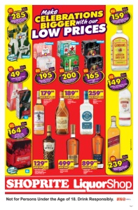 Page 2 Not for Persons Under the Age of 18. Drink Responsibly. 3l 3l WITH CARD SAVE R20 11499 OAKRIDGE NATURAL RED/WHITE WINE BLEND/SWEET ROSÉ WINE 3l each WITH CARD SAVE R30 14499 DROSTDY HOF ADELPRACHT WHITE/ SMOOTH CLARET RED WINE 3l each WITH CARD SAVE R20 8999 ROBERTSON WINERY ORANGE/BERRY MIMOSA SPARKLING SPRITZER 750ml each WITH CARD SAVE R10 5499 SEDGWICK’S OLD BROWN 750ml WITH CARD SAVE R15 8499 JUST WINE WHITE/ROSÉ PERLÉ SPARKLING WINE 6x250ml cans per pack SAVE R25 J.C. LE ROUX SPARKLING WINE all variants 6x250ml/300ml cans per pack OR VIVANTE RANGE 750ml each 8999 SAVE R30 FIRSTWATCH IMPORTED EXTRA FINE WHISKY 750ml 17999 1l WITH CARD SAVE R8 R36 SCHWEPPES DRINK all variants 2x1l ANY 2 FOR WITH CARD SAVE R10 R30 RED BULL ORIGINAL ENERGY DRINK 2x250ml 2 FOR ECLSLSALRO/E Valid from 9 March until 12 April 2026. Ts & Cs Apply. All purchases made with a Shoprite Xtra Savings Card and a qualifying Standard Bank Debit, Cheque or Credit Card, are eligible for the promotion GUARANTEED AIRTIME Get your share of SWIPE GET BUY Spend R350 at any Shoprite LiquorShop. Use your Standard Bank and Xtra Savings cards Check your till slip for your guaranteed airtime voucher. + OFFERS VALID FROM WEDNESDAY 25 MARCH 2026 UNTIL THURSDAY 09 APRIL 2026. PRICES APPLY TO SHOPRITE LIQUORSHOPS EASTERN CAPE PROVINCE. LIQUOR TRADING HOURS ARE SUBJECT TO GOVERNMENT REGULATIONS. LIQUOR ONLY AVAILABLE AT STORES WITH A VALID LIQUOR LICENCE. DEALS EXCLUDE WHOLESALE LIQUORSHOP. WE RESERVE THE RIGHT TO LIMIT QUANTITIES. NO TRADERS PLEASE. SELECTED ITEMS MAY NOT BE AVAILABLE AT CERTAIN STORES. VAT INCLUDED. ERRORS & OMISSIONS EXCEPTED (E&OE). WHILE STOCKS LAST. CUSTOMER CARE LINE 0800 01 07 09 (TOLL-FREE). 440ml 500ml 500ml 500ml 440ml TRY ME I’M NEW WITH CARD SAVE R10 8999 CINTRA PILSENER BEER 6x500ml cans WITH CARD SAVE R25 9499 KIX RASPBERRY PEACH/WILD BERRY SPARKLING SPRITZER 6x440ml cans WITH CARD SAVE R20 13999 BACARDI BREEZER all variants 6x440ml cans per pack WITH CARD SAVE R65 R165 FLYING FISH PRESSED LEMON FLAVOURED BEER 2x 6x500ml cans 2 FOR WITH CARD SAVE R55 R165 CASTLE LITE BEER 2x 6x500ml cans 2 FOR 660ml SAVE R15 AMSTEL LAGER BEER 3x660ml RB 3 FOR R54 EXCLUDING BOTTLE DEPOSIT WITH CARD SAVE R10 12499 AFRICAN DEW MARULA CREAM LIQUEUR all variants 750ml each WITH CARD SAVE R25 18499 SCOTTISH COLLIE BLENDED SCOTCH WHISKY 750ml WITH CARD SAVE R60 21999 BALLANTINE’S FINEST BLENDED SCOTCH WHISKY 750ml WITH CARD SAVE R40 25999 ROYAL FLUSH LUXE NOIR GIN 750ml WITH CARD SAVE R100 39999 MONKEY SHOULDER BLENDED MALT SCOTCH WHISKY 750ml WITH CARD SAVE R100 49999 JAMESON SELECT RESERVE BLENDED IRISH WHISKEY 750ml WITH CARD SAVE R60 20999 KLIPDRIFT PREMIUM BRANDY 750ml WITH CARD SAVE R100 23999 ABSOLUT ORIGINAL/ WATERMELON/ LIME VODKA 750ml each