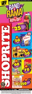www.shoprite.co.za www.shoprite.mobi follow us on OFFERS VALID FROM THURSDAY 16 APRIL TO SUNDAY 19 APRIL 2026 1 week only! OFFERS VALID FROM THURSDAY 16 APRIL TO SUNDAY 19 APRIL 2026. PRICES APPLY TO SHOPRITE HYPER GREENACRES AND UITENHAGE AND SHOPRITE STORES ALIWAL NORTH, AMALINDA, BEAUFORT WEST, BETHELSDORP, BOOYSEN PARK, BRIDGTON, BUTTERWORTH FINGOLAND, CAXTON STREET, CONCORDIA, CRADOCK, DAKU, DESPATCH, DUTYWA, ELLIOT, ELLIOTDALE, EMPUMALANGA-BUTTERWORTH, EZIBELENI, GEORGE, GILWELL, GOLDEN EGG, GOVAN MBEKI, GRAAFF-REINET, GRAHAMSTOWN, HUMANSDORP, JEFFREYS BAY, KENAKO, KENTANI, KING WILLIAM’S TOWN, KIRKWOOD, KNYSNA, KWANOBUHLE, KWANONQABA, LADY FRERE, MBASHE MALL, MDANTSANE, MDANTSANE CITY, MOTHERWELL, MQANDULI, MTHATHA PLAZA, NGCOBO, NGEBS, NGQELENI, OUDTSHOORN, PIER 14, PLETTENBERG BAY, QUEENSTOWN, STANDFORD SQUARE, STERKSPRUIT, STUTTERHEIM, THEMBALETHU, TSOMO, UMTATA AND ZIYABUYA. WHILE STOCKS LAST. WE RESERVE THE RIGHT TO LIMIT QUANTITIES. NO TRADERS. VAT INCLUDED. ERRORS AND OMISSIONS EXCEPTED. WWW.SHOPRITE.CO.ZA. CUSTOMER CARE LINE 0800 01 07 09 (TOLL-FREE). UP TO 40% OFF A R60 2 FOR SUNFOIL PURE SUNFLOWER SEED OIL 2l SAVE R30 R502 FOR NESCAFÉ RICOFFY INSTANT COFFEE 250g/250+30g each SAVE R30 R502 FOR CREMORA COFFEE CREAMER 750g SAVE R20 OR R25 ANY 2 FOR COCA-COLA ORIGINAL TASTE LESS SUGAR 1,25l/ SPARLETTA/TWIST SOFT DRINK all variants 2l SAVE R30 R70 RITEBRAND SUPER MAIZE MEAL 10kg R150GOLDI FROZEN CHICKEN MIXED PORTIONS 3,5kg SAVE R23 ECFOSLDUON/E 10kg 3,5kg