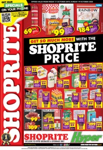 OFFERS VALID FROM FRIDAY 17 OCTOBER UNTIL SUNDAY 19 OCTOBER 2025 www.shoprite.co.za www.shoprite.mobi follow us on BUTCHERY LOVIES HYPER VALUE PACK PREMIUM DISPOSABLE NAPPIES per pack SAVE R41 R299 PRICE PER NAPPY MINI PACK OF 140 R2,13 MIDI PACK OF 112 R2,66 MAXI PACK OF 104 R2,87 JUNIOR PACK OF 96 R3,11 EXCLUSIVE TO HYPER GREENACRES & UITENHAGE ONLY OFFERS VALID FROM FRIDAY 17 OCTOBER UNTIL SUNDAY 19 OCTOBER 2025. PRICES APPLY TO SHOPRITE HYPER GREENACRES AND UITENHAGE STORES. WHILE STOCKS LAST. WE RESERVE THE RIGHT TO LIMIT QUANTITIES. NO TRADERS. VAT INCLUDED. ERRORS AND OMISSIONS EXCEPTED. CUSTOMER CARE LINE 0800 01 07 09 (TOLL-FREE). WITH THE PRICE GET SO MUCH MORE ECFOSHDPRJ/E SAVE R15 18499 RAINBOW FROZEN CHICKEN LEG QUARTERS 3,5kg 3,5kg SUPER C ENERGY DRINK all variants 500ml SAVE R9 ANY 2 FOR R17 AQUAFRESH FRESH & MINTY TOOTHPASTE 2x100ml per pack SAVE R30 3 FOR R99 FUTURELIFE CEREAL all variants 1,25kg each SAVE R36 R94 SECUREX BATH SOAP all variants 175g SAVE R6 R30 ANY 3 FOR JOLLY TOTS SENSITIVE BABY WIPES 3x80 per pack SAVE R11 R69 SQUISH BABY FOOD all variants 110ml SAVE R9 R30 ANY 3 FOR NIK NAKS MAIZE SNACK all variants 135g SAVE R16 R48 ANY 4 FOR OREO BISCUITS all variants 128g SAVE R12 R28 ANY 2 FOR CRICKLEY FULL CREAM AMASI MAAS 2l SAVE R14 R58 2 FOR 6999 THOMPSONS FRENCH POLONY 2kg MR ORANGE 6% ORANGE JUICE 6x300ml per pack SAVE R30 R50 2 FOR 10999 BEEF STEAK PACK per kg 9999 BEEF MINCE per kg R99SASKO CAKE WHEAT FLOUR 2,5kg + WHITE STAR SUPER MAIZE MEAL 2,5kg + SPEKKO LONG GRAIN PARBOILED RICE 2kg ALL 3 FOR IWISA NO1 SUPER MAIZE MEAL 10kg SAVE R31 R99 WEET-BIX WHOLEGRAIN WHEAT BISCUITS all variants 375g each SAVE R16 R29 HARVESTIME FROZEN COUNTRY MIX 900g SAVE R4 3599 NESTLÉ BAR-ONE/ TEX MILK CHOCOLATE GIANT BAR 84g/58g SAVE R14 R30 ANY 2 FOR GOLDI FROZEN CHICKEN LIVERS 250g SAVE R6 R33 3 FOR SAVE R5 CLASS 1 BEST BUY POTATOES 7kg pocket 4999 FRUIT &VEG SAVE 20% BANANAS per kg 1499
