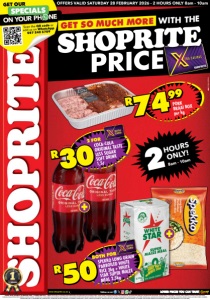 OFFERS VALID SATURDAY 28 FEBRUARY 2026 - 2 HOURS ONLY 8am - 10am www.shoprite.co.za www.shoprite.mobi follow us on OFFERS VALID SATURDAY 28 FEBRUARY 2026 - 2 HOURS ONLY 8am - 10am. PRICES APPLY TO SHOPRITE HYPER GREENACRES AND UITENHAGE AND SHOPRITE STORES ALIWAL NORTH, AMALINDA, BEAUFORT WEST, BETHELSDORP, BOOYSEN PARK, BRIDGTON, BUTTERWORTH FINGOLAND, CAXTON STREET, CONCORDIA, CRADOCK, DAKU, DESPATCH, DUTYWA, ELLIOT, ELLIOTDALE, EMPUMALANGA-BUTTERWORTH, EZIBELENI, GEORGE, GILWELL, GOLDEN EGG, GOVAN MBEKI, GRAAFF-REINET, GRAHAMSTOWN, HUMANSDORP, JEFFREYS BAY, KENAKO, KENTANI, KING WILLIAM’S TOWN, KIRKWOOD, KNYSNA, KWANOBUHLE, KWANONQABA, LADY FRERE, MBASHE MALL, MDANTSANE, MDANTSANE CITY, MOTHERWELL, MQANDULI, MTHATHA PLAZA, NGCOBO, NGEBS, NGQELENI, OUDTSHOORN, PIER 14, PLETTENBERG BAY, QUEENSTOWN, STANDFORD SQUARE, STERKSPRUIT, STUTTERHEIM, THEMBALETHU, TSOMO, UMTATA AND ZIYABUYA. WHILE STOCKS LAST. WE RESERVE THE RIGHT TO LIMIT QUANTITIES. NO TRADERS. VAT INCLUDED. ERRORS AND OMISSIONS.CUSTOMER CARE LINE 0800 01 07 09 (TOLL-FREE). ECFOSLDTZD/E WITH THE PRICE GET SO MUCH MORE HOURS ONLY! 8am - 10am 2 COCA-COLA ORIGINAL TASTE LESS SUGAR SOFT DRINK 1,5l 2 FOR R30 SPEKKO LONG GRAIN PARBOILED WHITE RICE 2kg + WHITE STAR SUPER MAIZE MEAL 2,5kg BOTH FOR R50 PORK BRAAI BOX per kg R7499