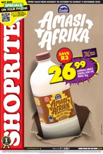 www.shoprite.co.za www.shoprite.mobi OFFER VALID FROM MONDAY 20 OCTOBER TO SUNDAY 9 NOVEMBER 2025 follow us on ECFOSLDQKE/E OFFER VALID FROM MONDAY 20 OCTOBER 2025 UNTIL SUNDAY 9 NOVEMBER 2025. PRICES APPLY TO SHOPRITE HYPER GREENACRES AND UITENHAGE AND SHOPRITE STORES ALIWAL NORTH, AMALINDA, BEAUFORT WEST, BETHELSDORP, BOOYSEN PARK, BRIDGTON, BUTTERWORTH FINGOLAND, CAXTON STREET, CONCORDIA, CRADOCK, DAKU, DESPATCH, DUTYWA, ELLIOT, ELLIOTDALE, EMPUMALANGA-BUTTERWORTH, EZIBELENI, GEORGE, GILWELL, GOLDEN EGG, GOVAN MBEKI, GRAAFF-REINET, GRAHAMSTOWN, HUMANSDORP, JEFFREYS BAY, KENAKO, KENTANI, KING WILLIAM’S TOWN, KIRKWOOD, KNYSNA, KWANOBUHLE, KWANONQABA, LADY FRERE, MBASHE MALL, MDANTSANE, MDANTSANE CITY, MOTHERWELL, MQANDULI, MTHATHA PLAZA, NGCOBO, NGEBS, NGQELENI, OUDTSHOORN, PIER 14, PLETTENBERG BAY, QUEENSTOWN, STANDFORD SQUARE, STERKSPRUIT, STUTTERHEIM, THEMBALETHU, TSOMO, UMTATA AND ZIYABUYA. WHILE STOCKS LAST. WE RESERVE THE RIGHT TO LIMIT QUANTITIES. NO TRADERS. VAT INCLUDED. ERRORS AND OMISSIONS EXCEPTED. CUSTOMER CARE LINE 0800 01 07 09 (TOLL-FREE). 2699 SAVE R3 SUNDALE AMASI AFRIKA LOW FAT MAAS 2kg