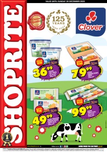 OFFERS VALID UNTIL SUNDAY 28 DECEMBER 2025. PRICES APPLY TO SHOPRITE STORES GAUTENG, MPUMALANGA, NORTH WEST & LIMPOPO PROVINCE, EXCLUDING GANYESA, IKAGENG, JOUBERTON, KANANA, KHUTSONG, KLERKSDORP TERMINUS, LEHURUTSHE, LICHTENBURG, MAFIKENG, MMABATHO, ORKNEY, PARYS, POTCHEFSTROOM, SASOLBURG, SCF KLERKSDORP, SCHWEIZER-RENEKE, VOLKSRUST, VRYBURG, WOLMARANSSTAD & ZEERUST. SOME ADVERTISED PRODUCTS IN THIS LEAFLET MAY NOT BE STOCKED AT SMALLER SHOPRITE STORES. WHILE STOCKS LAST. WE RESERVE THE RIGHT TO LIMIT QUANTITIES. NO TRADERS. VAT INCLUDED. ERRORS AND OMISSIONS EXCEPTED. CUSTOMER CARE LINE 0800 01 07 09 (TOLL-FREE). www.shoprite.co.za www.shoprite.mobi follow us on VALID UNTIL SUNDAY 28 DECEMBER 2025 GNFOSLDSEA/E 7999 CLOVER CHEDDAR/GOUDA CHEESE 550g each SAVE R30 3699 CLOVER FETA CHEESE all variants 200g each SAVE R10 4999 CLOVER PROCESSED CHEDDAR/GOUDA CHEESE SLICES 400g each SAVE R18 9999 CLOVER CHEESE SLICES all variants 950g each SAVE R35
