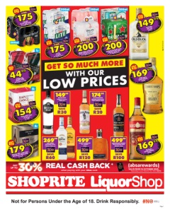 Page 1 Not for Persons Under the Age of 18. Drink Responsibly. GET UP TO30% *Depending on your Rewards Tier. T&Cs apply. VALID FROM 16 OCTOBER 2025. REAL CASH BACK when paying with your Absa card. SAVE R35 OLD BUCK DRY GIN 750ml 14999 SAVE R35 THREE SHIPS SELECT WHISKY 750ml 16999 SAVE R35 KLIPDRIFT EXPORT BRANDY 750ml 16999 SAVE R60 BRUTAL FRUIT SPARKLING SPIRIT COOLER all variants 2x 6x500ml cans ANY 2 FOR R200 SAVE R60 HEINEKEN PREMIUM SILVER/ ORIGINAL LAGER BEER 2x 6x500ml cans ANY 2 FOR R200 500ml 500ml GNLSLSALJC/E SAVE R45 CARLING BLACK LABEL BEER 2x 6x500ml cans 2 FOR R175 500ml JAMESON SELECT RESERVE TRIPLE DISTILLED IRISH WHISKEY 750ml SAVE R100 49999 RUSSIAN BEAR VODKA all variants 750ml each SAVE R30 14999 CAPTAIN MORGAN ORIGINAL SPICED GOLD SPIRIT APERITIF 750ml SAVE R20 17499 BISQUIT & DUBOUCHÉ V.S. COGNAC 750ml SAVE R120 49999 JOSE CUERVO REPOSADO/SILVER TEQUILA 750ml each SAVE R60 26999 SAVE R30 DROSTDY HOF CLARET RED/ ADELPRACHT WHITE WINE 5l each 17999 5l SAVE R45 CASTLE LITE BEER 2x 6x500ml cans 2 FOR R175 500ml GET SO MUCH MORE WITH OUR LOW PRICES SAVE R30 RAIN DANCE WINE all variants 5l each 15499 5l 1l SAVE R5 ROBERTSON WINERY WINE all variants 1l each 4499