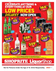 Finest whiskies. Supermarket prices. Page 2 OFFERS VALID FROM MONDAY 16 FEBRUARY 2026 UNTIL SUNDAY 1 MARCH 2026. PRICES ONLY APPLY TO SHOPRITE LIQUORSHOP DELAREY, SHOP NO. 05, ERF 355, C/O ONTDEKKERS ROAD & 10TH STREET, DELAREY ROODEPOORT, GAUTENG, 2114. ALCOHOL NOT FOR SALE TO PERSONS UNDER THE AGE OF 18. LIQUOR TRADING HOURS: MONDAY TO SATURDAY 8AM TO 8PM, SUNDAY 9AM TO 3:30PM. LIQUOR ONLY AVAILABLE AT STORES WITH A VALID LIQUOR LICENCE. WE RESERVE THE RIGHT TO LIMIT QUANTITIES. NO TRADERS PLEASE. SELECTED ITEMS MAY NOT BE AVAILABLE AT CERTAIN STORES. VAT INCLUDED. ERRORS & OMISSIONS EXCEPTED (E&OE). WHILE STOCKS LAST. CUSTOMER CARE LINE 0800 01 07 09 (TOLL-FREE). GNLSLSALTO/E 3999 SAVE R5 4TH STREET WINE all variants 1l each 17499 SAVE R20 CAPTAIN MORGAN ORIGINAL SPICED GOLD RUM 750ml R190 SAVE R40 CORONA EXTRA/CERO BEER 2x 6x355ml NRB ANY 2 FOR R200 SAVE R60 BRUTAL FRUIT SPARKLING RUBY APPLE/LITCHI SÈCHE/STRAWBERRY ROUGE SPIRIT COOLER 2x 6x500ml cans ANY 2 FOR 500ml Not for Persons Under the Age of 18. Drink Responsibly. 28999 SAVE R60 JACK DANIEL’S TENNESSEE WHISKEY all variants 750ml each 20999 SAVE R70 BELL’S BLENDED SCOTCH WHISKY 750ml 24999 SAVE R40 JOHNNIE WALKER RED LABEL BLENDED SCOTCH WHISKY 750ml R175 SAVE R55 FLYING FISH PREMIUM LEMON FLAVOURED BEER 2x 6x500ml cans 2 FOR 500ml 440ml 500ml 24999 SAVE R80 OLMECA REPOSADO/SILVER TEQUILA 750ml each 28999 SAVE R60 TANQUERAY GIN all variants 750ml each 1l BEERS & CIDERS WINE SPIRITS & LIQUEURS 16999 SAVE R35 KLIPDRIFT EXPORT BRANDY 750ml 14999 SAVE R30 AMARULA CREAM LIQUEUR all variants 750ml each R190 SAVE R50 WINDHOEK PREMIUM DRAUGHT BEER 2x 6x440ml NRB/ 2x 6x500ml cans per pack ANY 2 FOR 17499 SAVE R35 DROSTDY HOF CLARET RED/ADELPRACHT WHITE WINE 5l each 5l 23999 SAVE R40 SKYY VODKA all variants 750ml