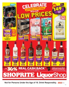 Page 2 Not for Persons Under the Age of 18. Drink Responsibly. 11999 SAVE R25 BELGRAVIA LONDON DRY GIN & TONIC/GIN & DRY LEMON/ GIN & DARK CHERRY SPIRIT COOLER 6x440ml cans per pack 440ml 440ml 11999 SAVE R30 CHILLERS PUNCH TEQUILA SUNRISE/PEACH & MANGO SPIRIT COOLER 6x440ml cans per pack GNLSLSAKCX/E OFFERS VALID FROM FRIDAY 24 OCTOBER 2025 UNTIL SUNDAY 9 NOVEMBER 2025. PRICES APPLY TO SHOPRITE LIQUORSHOPS GAUTENG, NORTHERN DIVISION, MPUMALANGA & LIMPOPO PROVINCE. LIQUOR TRADING HOURS ARE SUBJECT TO GOVERNMENT REGULATIONS. LIQUOR ONLY AVAILABLE AT STORES WITH A VALID LIQUOR LICENCE. DEALS EXCLUDE WHOLESALE LIQUORSHOP. WE RESERVE THE RIGHT TO LIMIT QUANTITIES. NO TRADERS PLEASE. SELECTED ITEMS MAY NOT BE AVAILABLE AT CERTAIN STORES. VAT INCLUDED. ERRORS & OMISSIONS EXCEPTED (E&OE). WHILE STOCKS LAST. CUSTOMER CARE LINE 0800 01 07 09 (TOLL-FREE). 4999 SAVE R10 JUST OLD BROWN 1l 1l 1l CASTLE LITE BEER 2x 6x500ml cans SAVE R45 R175 2 FOR 25999 SAVE R40 ROYAL FLUSH ORIGINAL/AMBER/NOIR GIN 750ml each HARRIER FINEST MATURED WHISKY 750ml SAVE R35 16499 FISH EAGLE NATURAL BRANDY 750ml SAVE R40 18999 CHATEAU DEL REI MIMOSA/BELLINI/ SANGRIA 6x440ml cans per pack SAVE R20 11999 440ml BELL’S BLENDED SCOTCH WHISKY 750ml SAVE R70 20999 4499 SAVE R5 ROBERTSON WINERY WINE all variants 1l each 25999 SAVE R70 JOSE CUERVO REPOSADO/ SILVER TEQUILA 750ml each 1l SAVE R60 BERNINI SPARKLING GRAPE CLASSIC/AMBER/BLUSH SPIRIT COOLER 2x 6x500ml cans ANY 2 FOR R200 SAVE R14 JUST WINE all variants 2x1l ANY 2 FOR R82 500ml 500ml 500ml FLYING FISH PRESSED LEMON FLAVOURED BEER 2x 6x500ml cans SAVE R55 R175 2 FOR GLENMORANGIE TRIPLE CASK RESERVE SINGLE MALT SCOTCH WHISKY 750ml SAVE R90 47999 5l 14999 SAVE R40 DELUSH NATURAL SWEET WINE all variants 5l each SAVE R25 4TH STREET WINE all variants 3l each 11999 3l NEW! EXCLUSIVE BABALAS RESCUE ENERGY DRINK 2x300ml cans SAVE R10 4999 2 FOR ANY 2 FOR R32 SCHWEPPES SOFT DRINK all variants 2x1l 1l MORE CHEERS WITH ICE-COLD BREWS J.C. LE ROUX SPARKLING WINE cans all variants 6x250ml per pack OR VIVANTE RANGE all variants 750ml each SAVE R15 8999