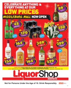Finest whiskies. Supermarket prices. Page 2 OFFERS VALID FROM MONDAY 27 OCTOBER 2025 UNTIL SUNDAY 9 NOVEMBER 2025. PRICES ONLY APPLY TO SHOPRITE LIQUORSHOP MIDDLEBURG MALL, MIDDELBURG MALL, FONTEIN STREET, BOUNDED BY SONDAGSRIVIER & DOLERITE CRESCENT, AERORAND, MIDDELBURG, MPUMALANGA, 1050. ALCOHOL NOT FOR SALE TO PERSONS UNDER THE AGE OF 18. LIQUOR TRADING HOURS: MONDAY TO FRIDAY 8AM TO 7PM, SATURDAY TO SUNDAY 9AM TO 5PM, PUBLIC HOLIDAYS 9AM TO 5PM. LIQUOR ONLY AVAILABLE AT STORES WITH A VALID LIQUOR LICENCE. WE RESERVE THE RIGHT TO LIMIT QUANTITIES. NO TRADERS PLEASE. SELECTED ITEMS MAY NOT BE AVAILABLE AT CERTAIN STORES. VAT INCLUDED. ERRORS & OMISSIONS EXCEPTED (E&OE). WHILE STOCKS LAST. CUSTOMER CARE LINE 0800 01 07 09 (TOLL-FREE). GNLSLSALAQ/E 27999 SAVE R70 TANQUERAY GIN all variants 750ml each 14999 SAVE R30 AMARULA CREAM LIQUEUR all variants 750ml each 17499 SAVE R20 CAPTAIN MORGAN ORIGINAL SPICED GOLD RUM 750ml R190 SAVE R40 CORONA EXTRA/CERO BEER 2x 6x355ml NRB ANY 2 FOR R200 SAVE R60 BRUTAL FRUIT SPARKLING RUBY APPLE/LITCHI SÈCHE/STRAWBERRY ROUGE SPIRIT COOLER 2x 6x500ml cans ANY 2 FOR 500ml Not for Persons Under the Age of 18. Drink Responsibly. 28999 SAVE R60 JACK DANIEL’S TENNESSEE WHISKEY all variants 750ml each 20999 SAVE R70 BELL’S BLENDED SCOTCH WHISKY 750ml 24999 SAVE R40 JOHNNIE WALKER RED LABEL BLENDED SCOTCH WHISKY 750ml SPIRITS & LIQUEURS R175 SAVE R55 FLYING FISH PREMIUM LEMON FLAVOURED BEER 2x 6x500ml cans 2 FOR 500ml 9499 SAVE R25 WINDHOEK PREMIUM DRAUGHT BEER 6x440ml NRB/ 6x500ml cans per pack 440ml 500ml 22999 SAVE R50 SKYY VODKA all variants 750ml each 24999 SAVE R80 OLMECA REPOSADO/SILVER TEQUILA 750ml each 16999 SAVE R35 KLIPDRIFT EXPORT BRANDY 750ml BEERS & CIDERS 11999 4TH STREET SWEET WHITE/ RED/ROSÉ/LATE HARVEST 3l each SAVE R25 3l WINE