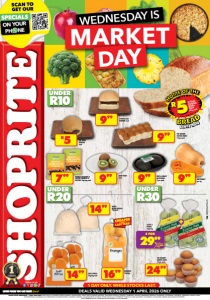 WEDNESDAY IS MARKET DAY 1 DAY ONLY. WHILE STOCKS LAST. OFFERS VALID WEDNESDAY 1 APRIL 2026 ONLY. PRICES APPLY TO SHOPRITE STORES GAUTENG, MPUMALANGA, NORTH WEST & LIMPOPO PROVINCE, EXCLUDING GANYESA, IKAGENG, JOUBERTON, KANANA, KLERKSDORP TERMINUS, LEHURUTSHE, LICHTENBURG, MAFIKENG, MMABATHO, ORKNEY, PARYS, POTCHEFSTROOM, SASOLBURG, SCF KLERKSDORP, SCHWEIZER-RENEKE, VOLKSRUST, VRYBURG, WOLMARANSSTAD & ZEERUST. WHILE STOCKS LAST. WE RESERVE THE RIGHT TO LIMIT QUANTITIES. NO TRADERS. VAT INCLUDED. ERRORS AND OMISSIONS EXCEPTED. WWW.SHOPRITE.CO.ZA. CUSTOMER CARE LINE 0800 01 07 09 (TOLL-FREE). ENGLISH DEALS VALID WEDNESDAY 1 APRIL 2026 ONLY 799 PADKOS ROASTED & SALTED PEANUTS & RAISINS 50g bag each 999 BUTTERNUT per kg 999 KIWI FRUIT each 999 RIPE & READY AVOCADOS 2 per pack 1499 SOFT CITRUS 1kg bag each 1699 ORANGES 1kg bag 2499 THE BAKERY QUEEN CAKES 10 per pack GNFOSLDTSJ/E R5 HOME OF THE BREAD IN-STORE STANDARD BROWN BREAD 600g each SINCE 2016 1499 WHITE BREAD DOUGH 1kg each UNDER R10 999 THE BAKERY SCHOOL BUNS 10 per pack R5 OX LIVER BURGER each 999 LIVER & EGG BURGER each CLASS 1 PEARS 1kg bag UNDER R20 UNDER R30 WITH CARD 2999 2 FOR