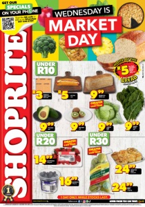 WEDNESDAY IS MARKET DAY 1 DAY ONLY. WHILE STOCKS LAST. UNDER R10 www.shoprite.co.za www.shoprite.mobi follow us on R5 HOME OF THE BREAD IN-STORE STANDARD BROWN BREAD 600g each SINCE 2016 GNFOSLDMKL/E OFFERS VALID WEDNESDAY 8 OCTOBER 2025 ONLY. PRICES APPLY TO SHOPRITE STORES GAUTENG, MPUMALANGA, NORTH WEST & LIMPOPO PROVINCE, EXCLUDING GANYESA, IKAGENG, JOUBERTON, KANANA, KLERKSDORP TERMINUS, LEHURUTSHE, LICHTENBURG, MAFIKENG, MMABATHO, ORKNEY, PARYS, POTCHEFSTROOM, SASOLBURG, SCF KLERKSDORP, SCHWEIZER-RENEKE, VOLKSRUST, VRYBURG, WOLMARANSSTAD & ZEERUST. SOME ADVERTISED PRODUCTS IN THIS LEAFLET MAY NOT BE STOCKED AT SMALLER SHOPRITE STORES. WHILE STOCKS LAST. WE RESERVE THE RIGHT TO LIMIT QUANTITIES. NO TRADERS. VAT INCLUDED. ERRORS AND OMISSIONS EXCEPTED. CUSTOMER CARE LINE 0800 01 07 09 (TOLL-FREE). 999 SPINACH BUNCH each R3PARMALAT SINGLE CHEESE SLICE each 1499 STRAWBERRIES 250g pack 2499 CLASS 1 PEARS 1,5kg bag 1699 BLUEBERRIES 125g cup UNDER R20 UNDER R30 999 AVOCADOS each 999 KIWI FRUIT each 2499 MONASTERY ROLLS 6 per pack R5HOT DOG each 999 BROWN RICE BREAD each 999 CABBAGE HEAD each