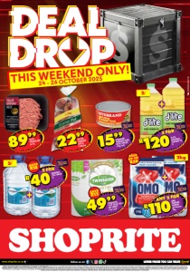 www.shoprite.co.za www.shoprite.mobi follow us on THIS WEEKEND ONLY! 24 - 26 OCTOBER 2025 SAVE R18 2 FOR R40BONAQUA STILL WATER 5l ANY 2 FOR R110OMO WASHING POWDER all Variants 2kg SAVE R12 4999 TWINSAVER 2-PLY TOILET ROLLS 200 SHEETS 9 per pack 1599 RITEBRAND SHREDDED TUNA IN OIL/WATER 170g each 5l 2kg OFFERS VALID FROM FRIDAY 24 OCTOBER 2025 TO SUNDAY 26 OCTOBER 2025. PRICES APPLY TO ALL SHOPRITE STORES BARKLEY ROAD, BATHLAROS, BETHLEHEM, CBD BLOEMFONTEIN, BLOEMFONTEIN, BLOEMHOF, BOITUMELO, BOTHAVILLE, BOTSHABELO, BOTSHABELO MALL, COLESBERG, DE AAR, DELAREYVILLE, FICKSBURG, FLEURDAL, GANYESA, HARTSWATER, HARRISMITH, HEIDEDAL, HEILBRON, IKAGENG, JAN KEMPDORP, KANANA, KATHU, KIMBERLEY, KIMBERLEY CENTRE, KLERKSDORP, KROONSTAD, KURUMAN, LADYBRAND, LEHRUTSE, LEMO MALL, LICHTENBURG, MMABATHO, MAFIKENG, MAITLAND, MANGAUNG, MANDELA PARK, MAOKENG, MIDDESTAD, MOMPATI MALL, MORENA MALL, NAVALSIG, ORKNEY, PAMPIERSTAD, PARYS, POTCHEFSTROOM, POSTMASBURG, POWER ROAD, SASOLBURG, SCHWEIZER-RENEKE, SENEKAL, SETSING, STILFONTEIN, TAUNG, THABA’NCHU, THABONG, UPINGTON, VENTERSDORP, VIRGINIA, VREDE, VRYBURG, WELKOM, WESSELSBRON, WOLMARANSSTAD & ZEERUST. ALL ADVERTISED PRODUCTS IN THIS LEAFLET MAY NOT BE STOCKED AT SHOPRITE VREDE, THABA’NCHU, THABONG AND MINI COLESBERG. WE RESERVE THE RIGHT TO LIMIT QUANTITIES. NO TRADERS. WHILE STOCKS LAST. VAT INCLUDED. ERRORS AND OMISSIONS EXCEPTED. CUSTOMER CARE LINE 0800 01 07 09 (TOLL-FREE). NCFOSLDQWY/E 8999 VALUE GROUND BEEF per kg 2299 SEASON STANDARD APPLES 1,5kg bag 2 FOR R120D’LITE VEGETABLE COOKING OIL 2l 2l SAVE UP TO R30