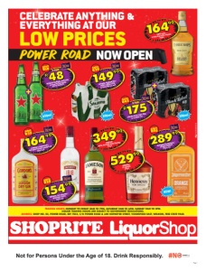 Finest whiskies. Supermarket prices. Page 2 OFFERS VALID FROM MONDAY 16 FEBRUARY 2026 UNTIL SUNDAY 1 MARCH 2026. PRICES ONLY APPLY TO SHOPRITE LIQUORSHOP POWER ROAD, SHOP NO. 03, POWER ROAD SHOPPING CENTRE, ERF 7855, C/O POWER ROAD & JAN HOFMEYER STREET, VOORSPOED EAST, WELKOM, FREE STATE 9460. ALCOHOL NOT FOR SALE TO PERSONS UNDER THE AGE OF 18. LIQUOR TRADING HOURS: MONDAY TO FRIDAY 8AM TO 7PM, SATURDAY 8AM TO 6PM, SUNDAY 9AM TO 3PM. LIQUOR ONLY AVAILABLE AT STORES WITH A VALID LIQUOR LICENCE. WE RESERVE THE RIGHT TO LIMIT QUANTITIES. NO TRADERS PLEASE. SELECTED ITEMS MAY NOT BE AVAILABLE AT CERTAIN STORES. VAT INCLUDED. ERRORS & OMISSIONS EXCEPTED (E&OE). WHILE STOCKS LAST. CUSTOMER CARE LINE 0800 01 07 09 (TOLL-FREE). NCLSLSALTU/E 3999 SAVE R5 4TH STREET WINE all variants 1l each Not for Persons Under the Age of 18. Drink Responsibly. 17499 SAVE R20 CAPTAIN MORGAN ORIGINAL SPICED GOLD RUM 750ml R190 SAVE R40 CORONA EXTRA/CERO BEER 2x 6x355ml NRB ANY 2 FOR R200 SAVE R60 BRUTAL FRUIT SPARKLING RUBY APPLE/LITCHI SÈCHE/STRAWBERRY ROUGE SPIRIT COOLER 2x 6x500ml cans ANY 2 FOR 500ml 28999 SAVE R60 JACK DANIEL’S TENNESSEE WHISKEY all variants 750ml each 20999 SAVE R70 BELL’S BLENDED SCOTCH WHISKY 750ml 24999 SAVE R40 JOHNNIE WALKER RED LABEL BLENDED SCOTCH WHISKY 750ml R175 SAVE R55 FLYING FISH PREMIUM LEMON FLAVOURED BEER 2x 6x500ml cans 2 FOR 500ml 440ml 500ml 24999 SAVE R80 OLMECA REPOSADO/SILVER TEQUILA 750ml each 28999 SAVE R60 TANQUERAY GIN all variants 750ml each 1l BEERS & CIDERS WINE SPIRITS & LIQUEURS 16999 SAVE R35 KLIPDRIFT EXPORT BRANDY 750ml 14999 SAVE R30 AMARULA CREAM LIQUEUR all variants 750ml each R190 SAVE R50 WINDHOEK PREMIUM DRAUGHT BEER 2x 6x440ml NRB/ 2x 6x500ml cans per pack ANY 2 FOR 17499 SAVE R35 DROSTDY HOF CLARET RED/ADELPRACHT WHITE WINE 5l each 5l 23999 SAVE R40 SKYY VODKA all variants 750ml