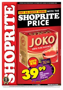 OFFERS VALID FROM FRIDAY 3 OCTOBER UNTIL SUNDAY 30 NOVEMBER 2025 www.shoprite.co.za www.shoprite.mobi follow us on OFFERS VALID FROM FRIDAY 3 OCTOBER UNTIL SUNDAY 30 NOVEMBER 2025. PRICES APPLY TO ALL SHOPRITE STORES BARKLEY ROAD, BETHLEHEM, BLOEMFONTEIN, BOITUMELO, BOTSHABELO, BOTSHABELO MALL, CBD BLOEMFONTEIN, COLESBERG, DE AAR, FICKSBURG, FLEURDAL, GANYESA, HARRISMITH, HARTSWATER, HEIDEDAL, HEILBRON, JAN KEMPDORP, KATHU, KIMBERLEY, KIMBERLEY CENTRE, KLERKSDORP, KROONSTAD, KURUMAN, LADYBRAND, LICHTENBURG, MAFIKENG, MAITLAND, MANDELA PARK, MANGAUNG, MIDDESTAD, MMABATHO, ORKNEY, PARYS, POSTMASBURG, POWER ROAD, SASOLBURG, SCHWEIZER-RENEKE, SETSING, STILFONTEIN, TAUNG, THABA’NCHU, THABONG, UPINGTON, VREDE, VRYBURG, WELKOM, WESSELSBRON & WOLMARANSSTAD. WE RESERVE THE RIGHT TO LIMIT QUANTITIES. NO TRADERS. WHILE STOCKS LAST. VAT INCLUDED. ERRORS AND OMISSIONS EXCEPTED. CUSTOMER CARE LINE 0800 01 07 09 (TOLL-FREE). SAVE R10 3999 JOKO PURE ROOIBOS TEABAGS 80 per pack WITH THE PRICE GET SO MUCH MORE NCFOSLDPVW/E