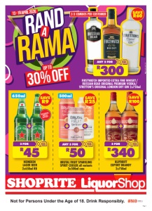Page 2 Not for Persons Under the Age of 18. Drink Responsibly. OFFERS VALID FROM MONDAY 13 APRIL 2026 UNTIL SUNDAY 19 APRIL 2026. PRICES APPLY TO SHOPRITE LIQUORSHOPS NATIONWIDE. LIQUOR TRADING HOURS ARE SUBJECT TO GOVERNMENT REGULATIONS. LIQUOR ONLY AVAILABLE AT STORES WITH A VALID LIQUOR LICENCE. DEALS EXCLUDE WHOLESALE LIQUORSHOP. WE RESERVE THE RIGHT TO LIMIT QUANTITIES. NO TRADERS PLEASE. SELECTED ITEMS MAY NOT BE AVAILABLE AT CERTAIN STORES. VAT INCLUDED. ERRORS & OMISSIONS EXCEPTED (E&OE). WHILE STOCKS LAST. CUSTOMER CARE LINE 0800 01 07 09 (TOLL-FREE) HOLSLSALTJ/E_REV 500ml CARLING BLACK LABEL BEER 3x500ml cans R45 3 FOR WITH CARD SAVE R15 SAVE R60 WITH CARD R185 DROSTDY HOF ADELPRACHT WHITE/ CLARET SELECT RED WINE 5l each + 1GB FREE K’NECT DATA VALUED AT R29 5l +1GB free data! SAVE R20 WITH CARD R120 4TH STREET WINE all variants 3l each 3l BUG SHOOTER all variants 4x20ml R50 ANY 4 FOR WITH CARD SAVE R20 SAVANNA PREMIUM DRY CIDER 2x500ml cans R50 2 FOR WITH CARD SAVE R16