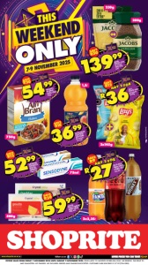 ONLY WEEKEND THIS 7-9 NOVEMBER 2025 www.shoprite.co.za www.shoprite.mobi follow us on SAVE R305999 CRYSTAL VALLEY CHEDDAR/ GOUDA CHEESE 500g each SAVE R125299 SENSODYNE TOOTHPASTE SELECTED VARIANTS 75ml each SAVE R205499 KELLOGG'S ALL-BRAN FLAKES CEREAL 750g SAVE R183699 CLOVER KRUSH 100% FRUIT JUICE BLEND all variants 1,5l each SAVE R50 13999 JACOBS INSTANT COFFEE all variants 200g/230g each SAVE R12 R36LAY'S POTATO CHIPS all variants 2x145g ANY 2 FOR SAVE R9 COCA-COLA/ FANTA/SPRITE/ STONEY ZERO 2x2,25l ANY 2 FOR R27 200g 750g 2x145g 75ml 500g 1,5l 2x2,25l 230g OR HOHBSL9344/E OFFERS VALID FROM FRIDAY 7 NOVEMBER 2025 UNTIL SUNDAY 9 NOVEMBER 2025. PRICES APPLY TO SHOPRITE STORES RSA ONLY. WE RESERVE THE RIGHT TO LIMIT QUANTITIES. NO TRADERS. VAT INCLUDED. ERRORS AND OMISSIONS EXCEPTED. CUSTOMER CARE LINE 0800 01 07 09 (TOLL-FREE).
