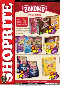 BOKOMO BOKOMOsouthafrica www.bokomo.co.za IT’S ALL WITHIN www.shoprite.co.za www.shoprite.mobi follow us on OFFERS VALID FROM MONDAY 6 OCTOBER UNTIL SUNDAY 9 NOVEMBER 2025 With plantbased protein. FEED YOUR GO with plant-based protein, packed with essential vitamins and minerals to power your every move. SAVE R8 3499 BOKOMO TRADITIONAL WHOLEGRAIN ROLLED OATS 1kg each WCFOSLDPPT/E OFFERS VALID FROM MONDAY 6 OCTOBER UNTIL SUNDAY 9 NOVEMBER 2025. PRICES VALID IN WESTERN CAPE ONLY (EXCLUDING BEAUFORT WEST, GEORGE, KNYSNA, MOSSEL BAY, OUDTSHOORN AND PLETTENBERG BAY). WHILE STOCKS LAST. WE RESERVE THE RIGHT TO LIMIT QUANTITIES. NO TRADERS. VAT INCLUDED. ERRORS & OMISSIONS EXCEPTED. CUSTOMER CARE LINE 0800 01 07 09 (TOLL-FREE). SAVE R10 4999 BOKOMO ORIGINAL CORN FLAKES 750g SAVE R13 4499 BOKOMO PRONUTRO CEREAL all variants 500g each SAVE R16 2899 BOKOMO WEET-BIX WHOLEGRAIN WHEAT BISCUITS all variants 375g each SAVE R30 R90BOKOMO OTEES ORIGINALS/ POPS CEREAL all variants 375g/400g each 2 FOR