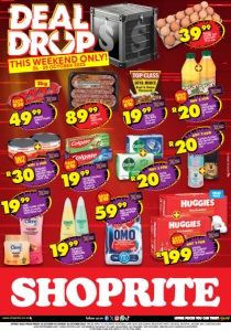 OFFERS VALID FROM FRIDAY 24 OCTOBER TO SUNDAY 26 OCTOBER 2025. PRICES APPLY TO SHOPRITE WESTERN CAPE ONLY (EXCLUDING BEAUFORT WEST, GEORGE, KNYSNA, MOSSEL BAY, OUDTSHOORN AND PLETTENBERG BAY). WHILE STOCKS LAST. WE RESERVE THE RIGHT TO LIMIT QUANTITIES. NO TRADERS. VAT INCLUDED. ERRORS AND OMISSIONS EXCEPTED. CUSTOMER CARE LINE 0800 01 07 09 (TOLL-FREE). www.shoprite.co.za www.shoprite.mobi follow us on THIS WEEKEND ONLY! 24 - 26 OCTOBER 2025 WCFOSLDPWD/E 3999 NULAID/ GOLDEN YOLK LARGE EGGS 18 per pack 8999 GRABOUW WORS THICK/THIN per kg SAVE R14 ANY 2 FOR R30RITEBRAND LIGHT MEAT SHREDDED TUNA IN VEGETABLE OIL/ WATER 170g SAVE R30 4999 RENOWN FRENCH POLONY 2kg SAVE R10 1999 TOP CLASS SOYA MINCE all variants 400g each SAVE R10 5999 OMO SUPERSOAK HAND WASHING POWDER 2kg ANY 2 FOR R20FUSION CONCENTRATED DAIRY BLEND all variants 1l SAVE R12 ANY 2 FOR R199HUGGIES DRY COMFORT VALUE PACK DISPOSABLE NAPPIES each SAVE R121 1999 CLERE HAND & BODY LOTION/ CRÈME all variants 300ml/400ml each ANY 2 FOR R20PLAYGIRL/PLAYBOY ROLL-ON FOR LADIES/ MEN all variants 50ml ANY 2 FOR R20DETTOL BATH SOAP all variants 175g 2kg SAVE R10 1999 COLGATE ORIGINAL/ GEL/HERBAL TOOTHPASTE all variants 100ml each VALUE PACK 1999 PALMOLIVE SHAMPOO/ CONDITIONER all variants 350ml each