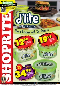 WCFOSLDQXA/E 3499 D’LITE 37% FAT SPREAD 1kg SAVE R8 1999D’LITE 37% FAT SPREAD 500g 1299D’LITE 40% FAT SPREAD 500g OFFERS VALID FROM MONDAY 10 NOVEMBER 2025 UNTIL SUNDAY 14 DECEMBER 2025. PRICES APPLY TO SHOPRITE WESTERN CAPE ONLY (EXCLUDING BEAUFORT WEST, GEORGE, KNYSNA, MOSSEL BAY, OUDTSHOORN AND PLETTENBERG BAY). WHILE STOCKS LAST. WE RESERVE THE RIGHT TO LIMIT QUANTITIES. NO TRADERS. VAT INCLUDED. ERRORS AND OMISSIONS EXCEPTED. CUSTOMER CARE LINE 0800 01 07 09 (TOLL-FREE). www.shoprite.co.za www.shoprite.mobi follow us on