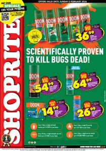 www.shoprite.co.za www.shoprite.mobi follow us on OFFERS VALID UNTIL SUNDAY 8 FEBRUARY 2026 SCIENTIFICALLY PROVEN TO KILL BUGS DEAD! Every 5 days, a single cockroach can lay up to 12 EGGS in your home. Every 5 days, a single fly can lay up to 357 EGGS in your home. Every 24 days, a single mosquito can suck blood up to 24 TIMES in your home. Every 3 days, a single ant can vommit up to 259,000 TIMES in your home. SAFETY INFORMATION: DANGER. Contains: Eucalyptus oil, nButane, Propane. Extremely flammable aerosol. Pressurised container: May burst if heated. May cause an allergic skin reaction. Very toxic to aquatic life. Harmful to aquatic life with long lasting effects. Suspected of causing cancer (DOOM Fogger ONLY), contains: D-Tetramethrin (Pyrethroid) 1.5 g/kg (DOOM Fogger ONLY). PRECAUTIONARY STATEMENTS: Read carefully and follow Registration Holder: Tiger Consumer Brands Ltd. (Reg. No. 1972/006590/06). 232 Corner Van Dyk & Power Street, Boksburg East, 1459. www.tigerbrands.com. Consumer careline: 0860 101 107. tigercsd@tigerbrands.com SAVE R15 5499 DOOM FOGGER DUAL ACTION INSECTICIDE 350ml SAVE R5 1499 DOOM SUPER DEADLY MOSQUITO COILS 125g SAVE R10 2699 DOOM BLUE DEATH MULTI INSECT POWDER 100g SAVE R15 6499 DOOM DESTROYER MOSQUITO ROOM SPRAY 300ml SAVE R13 3699 DOOM INSECTICIDE all variants 300ml each WCFMSL5858/E SELECTED STORE ONLY OFFERS VALID UNTIL SUNDAY 8 FEBRUARY 2026. PRICES APPLY TO SHOPRITE WESTERN CAPE ONLY (EXCLUDING BEAUFORT WEST, GEORGE, KNYSNA, MOSSEL BAY, OUDTSHOORN AND PLETTENBERG BAY). WHILE STOCKS LAST. WE RESERVE THE RIGHT TO LIMIT QUANTITIES. NO TRADERS. VAT INCLUDED. ERRORS AND OMISSIONS EXCEPTED. CUSTOMER CARE LINE 0800 01 07 09 (TOLL-FREE).