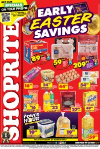 OFFERS VALID FROM FRIDAY 20 MARCH UNTIL SUNDAY 22 MARCH 2026. PRICES APPLY TO SHOPRITE WESTERN CAPE ONLY (EXCLUDING BEAUFORT WEST, GEORGE, KNYSNA, MOSSEL BAY, OUDTSHOORN AND PLETTENBERG BAY). WHILE STOCKS LAST. WE RESERVE THE RIGHT TO LIMIT QUANTITIES. NO TRADERS. VAT INCLUDED. ERRORS AND OMISSIONS EXCEPTED. WWW.SHOPRITE.CO.ZA. CUSTOMER CARE LINE 0800 01 07 09 (TOLL-FREE). www.shoprite.co.za www.shoprite.mobi EASTER SAVINGS EARLY follow us on VALID SATURDAY 21 MARCH ONLY WCFOSLDUEA/E WITH CARD SAVE R30 1999 BLOSSOM 25% FAT SPREAD 1kg FARMER’S CHOICE/ COUNTY FAIR FROZEN CHICKEN MIXED PORTIONS 5kg each 20999 SAVE R30 4499 NULAID LARGE EGGS 18 per pack WITH CARD 2499 OLÉ BREAD SPREAD 25% FAT SPREAD 1kg SAVE R12 COUNTY FAIR/ FARMBEST FRESH CHICKEN 5-PIECE BRAAIPACK per kg 5999 RITEBRAND LONG LIFE MILK all variants 6x1l per pack 8999 WITH CARD TAIT’S PUFFS MAIZE SNACK all variants 100g ANY 2 FOR R16 SAVE R6 SATURDAY 8am - 10am ONLY WITH CARD SAVE R15 5499 CLOVER CHEDDAR/ GOUDA FLAVOURED FULL CREAM PROCESSED CHEESE SLICES 400g WITH CARD SAVE R6 R22 JIVE SOFT DRINK all variants 2l ANY 2 FOR WITH CARD 2799 ALLSOME LONG GRAIN PARBOILED WHITE RICE 2kg WITH CARD SAVE R13 4999 ALPEN NUTRIFIC WHOLEWHEAT BISCUITS 900g 5999 D’LITE PURE COOKING OIL 2l 1699 BLUE RIBBON TOASTER WHITE BREAD 700g WITH CARD SAVE R5 1999 CLASS 1 POTATOES 2kg bag