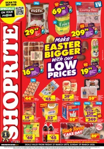 2l FARMER’S CHOICE/ COUNTY FAIR FROZEN CHICKEN MIXED PORTIONS 5kg each 20999 SAVE R30 5kg TASTIC RICE all variants 2kg each 2999 2kg CROWN BLENDED COOKING OIL 2l SAVE R9 6999 THE BAKERY TRADITIONAL HOT CROSS BUNS 6 per pack 1699 WAWI CHOCOLATE WRAPPED EASTER BUNNY 60g SAVE R10 1999 18s 4499 NULAID LARGE EGGS 18 per pack WITH CARD 3999 NOLA MAYONNAISE all variants 500g/730g/ 750g/780g each SAVE UP TO R15 5999 COUNTY FAIR/ FARMBEST FRESH CHICKEN 5-PIECE BRAAI PACK per kg WITH CARD COCA-COLA ORIGINAL TASTE LESS SUGAR SOFT DRINK 2l 2 FOR R45 SAVE R13 WITH CARD 5299 BOKOMO WEET-BIX WHOLEGRAIN WHEAT BISCUITS 900g SAVE R12 WITH CARD LAY’S POTATO CHIPS all variants 120g ANY 2 FOR R40 SAVE R10 8999 RITEBRAND LONG LIFE MILK all variants 6x1l per pack 6x1l WITH CARD 1499 FATTI’S & MONI’S SPAGHETTI/ MACARONI PASTA 500g each SAVE R5 WITH CARD TODAY ORIGINAL PUFF PASTRY 400g 2 FOR R45 OFFERS VALID FROM FRIDAY 27 MARCH UNTIL SUNDAY 29 MARCH 2026. PRICES APPLY TO SHOPRITE WESTERN CAPE ONLY (EXCLUDING BEAUFORT WEST, GEORGE, KNYSNA, MOSSEL BAY, OUDTSHOORN AND PLETTENBERG BAY). WHILE STOCKS LAST. WE RESERVE THE RIGHT TO LIMIT QUANTITIES. NO TRADERS. VAT INCLUDED.ERRORS AND OMISSIONS EXCEPTED. CUSTOMER CARE LINE 0800 01 07 09 (TOLL-FREE). WCFOSLDUSU/E ENGLISH DEALS VALID FROM FRIDAY 27 MARCH UNTIL SUNDAY 29 MARCH 2026 With our LOW PRICES EASTER BIGGER Make WITH CARD BUY 2 FOR BUY 1 FOR 13999 R249NESCAFÉ RICOFFY INSTANT COFFEE 750g/800g 750g 800g SAVE R85 VALID FROM 27 - 29 MARCH 2026. Visit our bakery and grab the perfect slice while SAVING! CAKE DAY Black Forest 8999 BLACK FOREST CAKE each