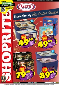 OFFERS VALID FROM WEDNESDAY 10 DECEMBER 2025 UNTIL SUNDAY 11 JANUARY 2026. PRICES APPLY TO SHOPRITE WESTERN CAPE ONLY (EXCLUDING BEAUFORT WEST, GEORGE, KNYSNA, MOSSEL BAY, OUDTSHOORN AND PLETTENBERG BAY). WHILE STOCKS LAST. WE RESERVE THE RIGHT TO LIMIT QUANTITIES. NO TRADERS. VAT INCLUDED. ERRORS AND OMISSIONS EXCEPTED. CUSTOMER CARE LINE 0800 01 07 09 (TOLL-FREE). this Festive Season Share the joy www.shoprite.co.za www.shoprite.mobi follow us on OFFERS VALID FROM 10 DECEMBER 2025 TO 11 JANUARY 2026 WCFOSLDSCL/E SAVE R20 8999 GATTI FANTASY ICE CREAM all variants 5l each SAVE R10 4999 GATTI ICE CREAM STICKS all variants 6x70ml per pack SAVE R10 7999 GATTI BIG DEAL ICE CREAM all variants 6x75ml per pack SAVE R10 4999 GATTI FANTASY ICE CREAM all variants 2l each 2l 5l