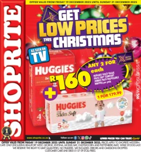 THIS OFFER VALID FROM FRIDAY 19 DECEMBER 2025 UNTIL SUNDAY 21 DECEMBER 2025. PRICES APPLY TO SHOPRITE WESTERN CAPE ONLY (EXCLUDING BEAUFORT WEST, GEORGE, KNYSNA, MOSSEL BAY, OUDTSHOORN AND PLETTENBERG BAY). WHILE STOCKS LAST. WE RESERVE THE RIGHT TO LIMIT QUANTITIES. NO TRADERS. VAT INCLUDED. ERRORS AND OMISSIONS EXCEPTED. CUSTOMER CARE LINE 0800 01 07 09 (TOLL-FREE). WCFOSLDRSS/E www.shoprite.co.za www.shoprite.mobi follow us on 1 FOR 179.99 HUGGIES GOLD VALUE PACK/DRY COMFORT JUMBO PACK DISPOSABLE NAPPIES per pack ANY 2 FOR R160each OFFER VALID FROM FRIDAY 19 DECEMBER 2025 UNTIL SUNDAY 21 DECEMBER 2025