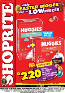 www.shoprite.co.za www.shoprite.mobi follow us on VALID FROM FRIDAY 3 APRIL UNTIL MONDAY 6 APRIL 2026 OFFERS VALID FROM FRIDAY 3 APRIL UNTIL MONDAY 6 APRIL 2026. PRICES APPLY TO SHOPRITE WESTERN CAPE ONLY (EXCLUDING BEAUFORT WEST, GEORGE, KNYSNA, MOSSEL BAY, OUDTSHOORN AND PLETTENBERG BAY). WHILE STOCKS LAST. WE RESERVE THE RIGHT TO LIMIT QUANTITIES. NO TRADERS. VAT INCLUDED. ERRORS AND OMISSIONS EXCEPTED. CUSTOMER CARE LINE 0800 01 07 09 (TOLL-FREE). ANY 2 FOR HUGGIES DRY COMFORT VALUE PACK DISPOSABLE NAPPIES 42/44/46/52/58 per pack R220 SAVE R100 LOWPRICES With our EASTER BIGGER Make VALUE PACK WCFOSLDUXX/E