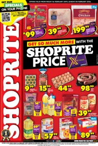 PRICE GET SO MUCH MORE WITH THE OFFERS VALID FROM FRIDAY 06 FEBRUARY UNTIL SUNDAY 08 FEBRUARY 2026. www.shoprite.co.za www.shoprite.mobi follow us on WCFOSLDTNE/E OFFERS VALID FROM FRIDAY 06 FEBRUARY UNTIL SUNDAY 08 FEBRUARY 2026. PRICES APPLY TO SHOPRITE WESTERN CAPE ONLY (EXCLUDING BEAUFORT WEST, GEORGE, KNYSNA, MOSSEL BAY, OUDTSHOORN AND PLETTENBERG BAY). WHILE STOCKS LAST. WE RESERVE THE RIGHT TO LIMIT QUANTITIES. NO TRADERS. VAT INCLUDED. ERRORS AND OMISSIONS EXCEPTED. CUSTOMER CARE LINE 0800 01 07 09 (TOLL-FREE). 5kg FARMER’S CHOICE FROZEN CHICKEN MIXED PORTIONS 5kg 19999 5799 SELATI PURE WHITE SUGAR 2,5kg 1599 SASKO MORE SLICES WHITE BREAD 700g 4499 NULAID LARGE EGGS 18 per pack 6x1l 8999 RITEBRAND LONG LIFE MILK all variants 6x1l per pack 3999 NOLA MAYONNAISE all variants 500ml/ 730g/750g/780g each JIVE COLD DRINK all variants 2l SAVE R6 R22 ANY 2 FOR KELLOGG’S CORN FLAKES CEREAL 1kg SAVE R15 6999 CROWN BLENDED COOKING OIL 2l SAVE R9 6999 2l 9899 KAROO WORS per kg 999 MOOIVALLEI CHEDDAR CHEESE per 100g TAIT’S POTATO CHIPS all variants 125g each SAVE R4 1499 FARMBEST FRESH CHICKEN BREASTS per kg 3999 BOKKIE RED/SMOKED VIENNAS 500g R99 ANY 4 FOR SAVE R20 FATTI’S & MONI’S SPAGHETTI/ MACARONI PASTA 500g each SAVE R4 R15