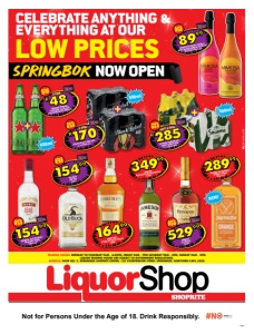 Finest whiskies. Supermarket prices. Page 2 OFFERS VALID FROM FRIDAY 12 DECEMBER 2025 UNTIL SUNDAY 21 DECEMBER 2025. PRICES ONLY APPLY TO SHOPRITE LIQUORSHOP SPRINGBOK SHOPRITE CENTRE , SHOP NO. 2, SPRINGBOK SHOPRITE CENTRE, 135 VOORTREKKER STREET, SPRINGBOK, NORTHERN CAPE, 8240. ALCOHOL NOT FOR SALE TO PERSONS UNDER THE AGE OF 18. LIQUOR TRADING HOURS: MONDAY TO THURSDAY 9AM TO 6:30PM, FRIDAY 9AM TO 7PM SATURDAY 9AM TO 4PM, SUNDAY 9AM TO 2PM. LIQUOR ONLY AVAILABLE AT STORES WITH A VALID LIQUOR LICENCE. WE RESERVE THE RIGHT TO LIMIT QUANTITIES. NO TRADERS PLEASE. SELECTED ITEMS MAY NOT BE AVAILABLE AT CERTAIN STORES. VAT INCLUDED. ERRORS & OMISSIONS EXCEPTED (E&OE). WHILE STOCKS LAST. CUSTOMER CARE LINE 0800 01 07 09 (TOLL-FREE). WCLSLSALLM/E 27999 SAVE R70 TANQUERAY GIN all variants 750ml each 17499 SAVE R20 CAPTAIN MORGAN ORIGINAL SPICED GOLD RUM 750ml R190 SAVE R40 CORONA EXTRA/CERO BEER 2x 6x355ml NRB ANY 2 FOR R200 SAVE R60 BRUTAL FRUIT SPARKLING RUBY APPLE/LITCHI SÈCHE/STRAWBERRY ROUGE SPIRIT COOLER 2x 6x500ml cans ANY 2 FOR 500ml Not for Persons Under the Age of 18. Drink Responsibly. 28999 SAVE R60 JACK DANIEL’S TENNESSEE WHISKEY all variants 750ml each 20999 SAVE R70 BELL’S BLENDED SCOTCH WHISKY 750ml SPIRITS & LIQUEURS R175 SAVE R55 FLYING FISH PREMIUM LEMON FLAVOURED BEER 2x 6x500ml cans 2 FOR 500ml 440ml 500ml 14999 AMARULA CREAM LIQUEUR all variants 750ml each 24999 SAVE R80 OLMECA REPOSADO/SILVER TEQUILA 750ml each BEERS & CIDERS JOHNNIE WALKER RED LABEL BLENDED SCOTCH WHISKY 750ml 24999 22999 SKYY VODKA all variants 750ml each 15999 SAVE R40 OLOF BERGH BRANDY 750ml R190 SAVE R50 WINDHOEK PREMIUM DRAUGHT BEER 2x 6x440ml NRB/ 2x 6x500ml cans ANY 2 FOR 14999 RAIN DANCE WINE all variants 5l each SAVE R35 5l 4499 DROSTDY HOF CLARET RED/ADELPRACHT WHITE WINE 1l each SAVE R5 WINE 1l