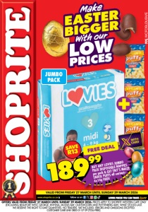 www.shoprite.co.za www.shoprite.mobi follow us on VALID FROM FRIDAY 27 MARCH UNTIL SUNDAY 29 MARCH 2026 OFFERS VALID FROM FRIDAY 27 MARCH UNTIL SUNDAY 29 MARCH 2026. PRICES APPLY TO SHOPRITE WESTERN CAPE ONLY (EXCLUDING BEAUFORT WEST, GEORGE, KNYSNA, MOSSEL BAY, OUDTSHOORN AND PLETTENBERG BAY). WHILE STOCKS LAST. WE RESERVE THE RIGHT TO LIMIT QUANTITIES. NO TRADERS. VAT INCLUDED. ERRORS AND OMISSIONS EXCEPTED. CUSTOMER CARE LINE 0800 01 07 09 (TOLL-FREE). 5kg With our LOW PRICES EASTER BIGGER Make JUMBO PACK WCFOSLDUSV/E FREE DEAL BUY ANY LOVIES JUMBO PACK DISPOSABLE NAPPIES per pack & GET TAIT’S MAIZE SNACK PUFFS all variants 4x14g FREE! 18999 SAVE R13