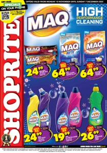 www.shoprite.co.za www.shoprite.mobi follow us on OFFERS VALID FROM MONDAY 10 NOVEMBER UNTIL SUNDAY 7 DECEMBER 2025 OFFERS VALID FROM MONDAY 10 NOVEMBER UNTIL SUNDAY 7 DECEMBER 2025. PRICES APPLY TO SHOPRITE WESTERN CAPE ONLY (EXCLUDING BEAUFORT WEST, GEORGE, KNYSNA, MOSSEL BAY, OUDTSHOORN AND PLETTENBERG BAY). WHILE STOCKS LAST. WE RESERVE THE RIGHT TO LIMIT QUANTITIES. NO TRADERS. VAT INCLUDED. ERRORS AND OMISSIONS EXCEPTED. CUSTOMER CARE LINE 0800 01 07 09 (TOLL-FREE). SAVE R10 6499 MAQ AUTO WASHING POWDER 2kg each SAVE R5 6499 MAQ HAND WASHING POWDER 2kg SAVE R5 1999 MAQ ALL PURPOSE CLEANER all variants 750ml each SAVE R5 2499 MAQ THICK BLEACH all variants 750ml each SAVE R3 2699 MAQ DISHWASHING LIQUID 750ml WCFOSLDQGR/E 2kg 2kg 2499 MAQ FABRIC SOFTENER REFILL all variants 500ml each