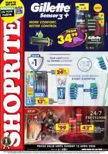 www.shoprite.co.za www.shoprite.mobi follow us on SCAN TO GET OUR SPECIALS ON YOUR PHONE WITH CARD SAVE R20 4299 OLD SPICE DEODORANT FOR MEN all variants 150ml each WITH CARD SAVE R81 R99 OLD SPICE STICK all variants 50ml ANY 2 FOR WITH CARD 1399 ORAL-B MANUAL TOOTHBRUSH RANGE FROM WITH CARD 2499 ORAL-B TOOTHPASTE RANGE FROM OFFERS VALID UNTIL SUNDAY 12 APRIL 2026. PRICES APPLY TO SHOPRITE WESTERN CAPE ONLY (EXCLUDING BEAUFORT WEST, GEORGE, KNYSNA, MOSSEL BAY, OUDTSHOORN AND PLETTENBERG BAY). WHILE STOCKS LAST. WE RESERVE THE RIGHT TO LIMIT QUANTITIES. NO TRADERS. VAT INCLUDED. ERRORS AND OMISSIONS EXCEPTED. WWW.SHOPRITE.CO.ZA. CUSTOMER CARE LINE 0800 01 07 09 (TOLL-FREE). PRICES VALID UNTIL SUNDAY 12 APRIL 2026 WCFOSLDUNO/E 3499 GILLETTE DISPOSABLE RAZORS RANGE each FROM