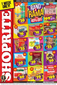 www.shoprite.co.za www.shoprite.mobi follow us on WCFOSLDPVO/E 2l SAVE R8 R20 JIVE COLD DRINK all variants 2l ANY 2 FOR SAVE R5 R25 DARLING FRESH MILK all variants 1l ANY 2 FOR SAVE R7 R25 SASKO MORE SLICES BROWN BREAD 700g 2 FOR SAVE R9 R25 RITEBRAND SPAGHETTI/ MACARONI 500g ANY 2 FOR SAVE R31 R79 BOKOMO WEET-BIX WHOLEGRAIN WHEAT BISCUITS 450g + CORN FLAKES 1kg BOTH FOR VALUE PACK SAVE R121 R199 HUGGIES DRY COMFORT VALUE PACK DISPOSABLE NAPPIES per pack ANY 2 FOR 5kg 19999 COUNTY FAIR FROZEN CHICKEN MIXED PORTIONS 5kg R10 RITEBRAND BAKED BEANS IN TOMATO SAUCE 410g each SAVE R3 R10 BLOSSOM LITE 25% FAT SPREAD 500g SAVE R8 R30 RITEBRAND FROZEN MIXED VEGETABLES 900g SAVE R10 R30 ALLSOME LONG GRAIN PARBOILED RICE 2kg SAVE R9 R15 FRIMAX POTATO CHIPS all variants 125g each SAVE R5 R60 CRYSTAL VALLEY GOUDA/ CHEDDAR CHEESE 500g each SAVE R30 R50 NESCAFÉ RICOFFY INSTANT COFFEE all variants 250g each SAVE R25 OFFERS VALID FROM FRIDAY 17 OCTOBER TO SUNDAY 19 OCTOBER 2025 OFFERS VALID FROM FRIDAY 17 OCTOBER TO SUNDAY 19 OCTOBER 2025. PRICES APPLY TO SHOPRITE WESTERN CAPE ONLY (EXCLUDING BEAUFORT WEST, GEORGE, KNYSNA, MOSSEL BAY, OUDTSHOORN AND PLETTENBERG BAY). WHILE STOCKS LAST. WE RESERVE THE RIGHT TO LIMIT QUANTITIES. NO TRADERS. VAT INCLUDED. ERRORS AND OMISSIONS EXCEPTED. CUSTOMER CARE LINE 0800 01 07 09 (TOLL-FREE). RAND RAMA A UP TO 40% OFF 1 week only!