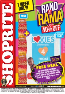 www.shoprite.co.za www.shoprite.mobi follow us on 1 week only! RAND RAMA A UP TO 40% OFF OFFER VALID FROM FRIDAY 17 OCTOBER UNTIL SUNDAY 19 OCTOBER 2025. PRICES APPLY TO SHOPRITE WESTERN CAPE ONLY (EXCLUDING BEAUFORT WEST, GEORGE, KNYSNA, MOSSEL BAY, OUDTSHOORN AND PLETTENBERG BAY). WHILE STOCKS LAST. WE RESERVE THE RIGHT TO LIMIT QUANTITIES. NO TRADERS. VAT INCLUDED. ERRORS AND OMISSIONS EXCEPTED. CUSTOMER CARE LINE 0800 01 07 09 (TOLL-FREE). FREE JUMBO PACK BUY ANY LOVIES PREMIUM JUMBO PACK DISPOSABLE NAPPIES per pack AND GET TAIT’S PUFFS MAIZE SNACK all variants 4x14g per pack FREE! FREE DEAL WCFOSLDPVP/E