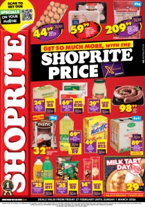 OFFERS VALID FROM FRIDAY 27 FEBRUARY UNTIL SUNDAY 1 MARCH 2026. PRICES APPLY TO SHOPRITE WESTERN CAPE ONLY (EXCLUDING BEAUFORT WEST, GEORGE, KNYSNA, MOSSEL BAY, OUDTSHOORN AND PLETTENBERG BAY). WHILE STOCKS LAST. WE RESERVE THE RIGHT TO LIMIT QUANTITIES. NO TRADERS. VAT INCLUDED. ERRORS AND OMISSIONS EXCEPTED. CUSTOMER CARE LINE 0800 01 07 09 (TOLL-FREE). COUNTY FAIR/ FARMER’S CHOICE FROZEN CHICKEN MIXED PORTIONS 5kg each 20999 5kg NULAID LARGE EGGS 18 per pack 4499 2499 SAVE R5 MARVELLO ORIGINAL 70% FAT SPREAD 500g FAIR CAPE FULL CREAM/LOW FAT LONG LIFE MILK 6x1l per pack BUY 1 FOR 15.99 each 8999 6x1l 6999 SAVE R20 CRYSTAL VALLEY CHEDDAR/GOUDA CHEESE 500g each 3999 SAVE R5 CROSSE & BLACKWELL TANGY MAYONNAISE 750g 6999 SAVE R9 CROWN BLENDED COOKING OIL 2l 3299 TASTIC LONG GRAIN PARBOILED RICE 2kg 2kg MILK TART DAY VALID 27 FEBRUARY - 1 MARCH 2026 VISIT OUR BAKERY NOW FOR DELECTABLE DEALS 4999 SAVE R13 ALPEN NUTRIFIC WHOLEWHEAT BISCUITS 900g MILK TART DAY VALID 27 FEBRUARY - 1 MARCH 2026 VISIT OUR BAKERY NOW FOR DELECTABLE DEALS ENGLISH DEALS VALID FROM FRIDAY 27 FEBRUARY UNTIL SUNDAY 1 MARCH 2026 2999 MILK TART each R25 SAVE R11 SPARLETTA/TWIST SOFT DRINK all variants 2l ANY 2 FOR R35 SAVE R9 SIMBA FLAVOURED POTATO CHIPS all variants 120g ANY 2 FOR 1499 SAVE R5 BEACON CHOCOLATE SLAB all variants 80g each 5999 FARMBEST/ COUNTY FAIR FRESH CHICKEN BRAAI PACK per kg 9899 KAROO WORS per kg GET SO MUCH MORE, WITH THE PRICE SCAN TO GET OUR SPECIALS ON YOUR PHONE WCFOSLDTYO/E