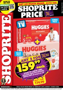 OFFERS VALID FROM FRIDAY 27 FEBRUARY UNTIL SUNDAY 1 MARCH 2026. PRICES APPLY TO SHOPRITE WESTERN CAPE ONLY (EXCLUDING BEAUFORT WEST, GEORGE, KNYSNA, MOSSEL BAY, OUDTSHOORN AND PLETTENBERG BAY). WHILE STOCKS LAST. WE RESERVE THE RIGHT TO LIMIT QUANTITIES. NO TRADERS. VAT INCLUDED. ERRORS AND OMISSIONS EXCEPTED. CUSTOMER CARE LINE 0800 01 07 09 (TOLL-FREE). ENGLISH DEALS VALID FROM FRIDAY 27 FEBRUARY UNTIL SUNDAY 1 MARCH 2026 GET SO MUCH MORE, WITH THE PRICE SCAN TO GET OUR SPECIALS ON YOUR PHONE WCFOSLDTYP/E JUMBO PACK VALUE PACK BUY 1 FOR 179.99 ANY 2 FOR 15999 HUGGIES DRY COMFORT JUMBO PACK/GOLD VALUE PACK DISPOSABLE NAPPIES/PANTS all variants per pack each