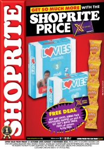 WCFOSLDQTJ/E www.shoprite.co.za www.shoprite.mobi follow us on PRICE GET SO MUCH MORE WITH THE OFFER VALID FROM FRIDAY 31 OCTOBER UNTIL SUNDAY 2 NOVEMBER 2025. PRICES APPLY TO SHOPRITE WESTERN CAPE ONLY (EXCLUDING BEAUFORT WEST, GEORGE, KNYSNA, MOSSEL BAY, OUDTSHOORN AND PLETTENBERG BAY). WHILE STOCKS LAST. WE RESERVE THE RIGHT TO LIMIT QUANTITIES. NO TRADERS. VAT INCLUDED. ERRORS AND OMISSIONS EXCEPTED. CUSTOMER CARE LINE 0800 01 07 09 (TOLL-FREE). FREE DEAL BUY ANY LOVIES JUMBO PACK DISPOSABLE NAPPIES per pack & GET TAIT’S MAIZE SNACK PUFFS all variants 4x14g FREE!