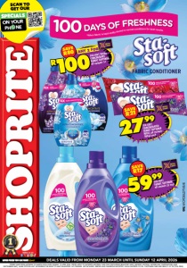 OFFERS VALID FROM MONDAY 23 MARCH 2026 UNTIL SUNDAY 12 APRIL 2026. PRICES APPLY TO SHOPRITE WESTERN CAPE ONLY (EXCLUDING BEAUFORT WEST, GEORGE, KNYSNA, MOSSEL BAY, OUDTSHOORN AND PLETTENBERG BAY). WHILE STOCKS LAST. WE RESERVE THE RIGHT TO LIMIT QUANTITIES. NO TRADERS. VAT INCLUDED. ERRORS AND OMISSIONS EXCEPTED. WWW.SHOPRITE.CO.ZA. CUSTOMER CARE LINE 0800 01 07 09 (TOLL-FREE). ENGLISH DEALS VALID FROM MONDAY 23 MARCH UNTIL SUNDAY 12 APRIL 2026 SCAN TO GET OUR SPECIALS ON YOUR PHONE SAVE R21 2799 STA-SOFT CONCENTRATED FABRIC SOFTENER REFILL all variants 500ml each ANY 2 FOR SAVE R80 R100STA-SOFT ULTRA CONCENTRATE FABRIC SOFTENER all variants 1l SAVE R17 5999 STA-SOFT FABRIC SOFTENER all variants 2l each WCFOSLDTVS/E