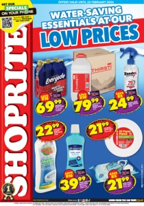 OFFERS VALID UNTIL SUNDAY 22 FEBRUARY 2026. PRICES APPLY TO SHOPRITE LADYSMITH & RIVERSDAL ONLY. WHILE STOCKS LAST. WE RESERVE THE RIGHT TO LIMIT QUANTITIES. NO TRADERS. VAT INCLUDED. ERRORS AND OMISSIONS EXCEPTED. CUSTOMER CARE LINE 0800 01 07 09 (TOLL-FREE). LOW PRICES WATER-SAVING ESSENTIALS AT OUR OFFERS VALID UNTIL 22 FEBRUARY 2026 www.shoprite.co.za www.shoprite.mobi follow us on WCFOSLDSNF/E_REV RITEBRAND PAPER PLATES 20 per pack 21 99 SUPER BRITE ORIGINAL THICK BLEACH 750ml 2299 SAVE R5 2499 HANDEX LIQUID HAND SANITISER 350ml SAVE R10 3999 RENEW ORALCARE MOUTH WASH all variants 500ml each SAVE R521 99 SATIN TOUCH TOILET WIPES 42 per pack SAVE R10 6999 ENERGADE SPORTS DRINK all variants 6x500ml SAVE R10 7999 THIRSTI STILL NATURAL SPRING WATER 4x5l