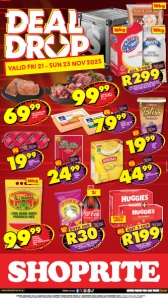 www.shoprite.co.za www.shoprite.mobi follow us on VALID FRI 21 - SUN 23 NOV 2025 VALUE PACK 9999 STEWING BEEF/ BEEF POTJIEKOS per kg BOTH FOR SAVE R8 COCA-COLA ORIGINAL TASTE LESS SUGAR SOFT DRINK 2l + TRUDA SPOOKIES MAIZE PUFFS 100g each R30 R199 ANY 2 FOR SAVE R121 HUGGIES DRY COMFORT DISPOSABLE NAPPIES 42/44/46/52/58 OFFERS AVAILABLE AT ALL KWAZULU-NATAL SHOPRITE STORES FROM FRIDAY 21 NOVEMBER UNTIL SUNDAY 23 NOVEMBER 2025. WHILE STOCKS LAST. WE RESERVE THE RIGHT TO LIMIT QUANTITIES. 3 DEALS PER CUSTOMER. NO TRADERS. VAT INCLUDED. ERRORS AND OMISSIONS EXCEPTED. CUSTOMER CARE LINE 0800 01 07 09 (TOLL-FREE). BOKKIE VIENNAS 500g SAVE R15 2499 10kg CLOVER GOUDA/CHEDDAR CHEESE 550g each SAVE R30 7999 9999 OSMAN’S TAJ MAHAL LONG GRAIN WHITE PARBOILED RICE 10kg R299 ALL 3 FOR AUNT CAROLINE LONG GRAIN PARBOILED RICE 10kg + GOLDEN CLOUD CAKE WHEAT FLOUR 10kg + SUPER WHITE MAIZE MEAL 10kg BOKOMO CORN FLAKES CEREAL 1kg SAVE R25 4499 10kg 10kg 10kg 6999 PRE-COOKED PORK SHOULDER RIBS per kg 2l CLOVER BLISS 500g SAVE R13 1999 RENOWN FRENCH POLONY 750g SAVE R10 1999 ZNFOSRDRPK_E