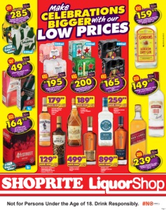 Page 2 Not for Persons Under the Age of 18. Drink Responsibly. Valid from 9 March until 12 April 2026. Ts & Cs Apply. All purchases made with a Shoprite Xtra Savings Card and a qualifying Standard Bank Debit, Cheque or Credit Card, are eligible for the promotion GUARANTEED AIRTIME Get your share of SWIPE GET BUY Spend R350 at any Shoprite LiquorShop. Use your Standard Bank and Xtra Savings cards Check your till slip for your guaranteed airtime voucher. + OFFERS VALID FROM WEDNESDAY 25 MARCH 2026 UNTIL THURSDAY 09 APRIL 2026. PRICES APPLY TO SHOPRITE LIQUORSHOPS KWAZULU-NATAL PROVINCE. LIQUOR TRADING HOURS ARE SUBJECT TO GOVERNMENT REGULATIONS. LIQUOR ONLY AVAILABLE AT STORES WITH A VALID LIQUOR LICENCE. DEALS EXCLUDE WHOLESALE LIQUORSHOP. WE RESERVE THE RIGHT TO LIMIT QUANTITIES. NO TRADERS PLEASE. SELECTED ITEMS MAY NOT BE AVAILABLE AT CERTAIN STORES. VAT INCLUDED. ERRORS & OMISSIONS EXCEPTED (E&OE). WHILE STOCKS LAST. CUSTOMER CARE LINE 0800 01 07 09 (TOLL-FREE). 660ml 440ml 500ml SAVE R15 AMSTEL LAGER BEER 3x660ml RB 3 FOR R54 3l SAVE R30 FIRSTWATCH IMPORTED EXTRA FINE WHISKY 750ml 17999 1l ZNLSLSALRQ/E 500ml 500ml EXCLUDING BOTTLE DEPOSIT 440ml TRY ME I’M NEW SAVE R25 J.C. LE ROUX SPARKLING WINE all variants 6x250ml/300ml cans per pack OR VIVANTE RANGE 750ml each 8999 3l WITH CARD SAVE R10 8999 CINTRA PILSENER BEER 6x500ml cans WITH CARD SAVE R20 11499 OAKRIDGE NATURAL RED/WHITE WINE BLEND/SWEET ROSÉ WINE 3l each WITH CARD SAVE R30 14499 DROSTDY HOF ADELPRACHT WHITE/ SMOOTH CLARET RED WINE 3l each WITH CARD SAVE R10 12499 AFRICAN DEW MARULA CREAM LIQUEUR all variants 750ml each WITH CARD SAVE R25 18499 SCOTTISH COLLIE BLENDED SCOTCH WHISKY 750ml WITH CARD SAVE R60 21999 BALLANTINE’S FINEST BLENDED SCOTCH WHISKY 750ml WITH CARD SAVE R40 25999 ROYAL FLUSH LUXE NOIR GIN 750ml WITH CARD SAVE R100 39999 MONKEY SHOULDER BLENDED MALT SCOTCH WHISKY 750ml WITH CARD SAVE R100 49999 JAMESON SELECT RESERVE BLENDED IRISH WHISKEY 750ml WITH CARD SAVE R60 20999 KLIPDRIFT PREMIUM BRANDY 750ml WITH CARD SAVE R100 23999 ABSOLUT ORIGINAL/ WATERMELON/ LIME VODKA 750ml each WITH CARD SAVE R20 8999 ROBERTSON WINERY ORANGE/BERRY MIMOSA SPARKLING SPRITZER 750ml each WITH CARD SAVE R10 5499 SEDGWICK’S OLD BROWN 750ml WITH CARD SAVE R25 9499 KIX RASPBERRY PEACH/WILD BERRY SPARKLING SPRITZER 6x440ml cans WITH CARD SAVE R20 13999 BACARDI BREEZER all variants 6x440ml cans per pack WITH CARD SAVE R65 R165 FLYING FISH PRESSED LEMON FLAVOURED BEER 2x 6x500ml cans 2 FOR WITH CARD SAVE R8 R36 SCHWEPPES DRINK all variants 2x1l ANY 2 FOR WITH CARD SAVE R55 R165 CASTLE LITE BEER 2x 6x500ml cans 2 FOR WITH CARD SAVE R15 8499 JUST WINE WHITE/ROSÉ PERLÉ SPARKLING WINE 6x250ml cans per pack WITH CARD SAVE R10 R30 RED BULL ORIGINAL ENERGY DRINK 2x250ml 2 FOR