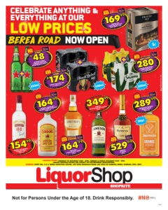 Finest whiskies. Supermarket prices. Page 2 OFFERS VALID FROM THURSDAY 23 OCTOBER 2025 UNTIL SUNDAY 2 NOVEMBER 2025. PRICES ONLY APPLY TO SHOPRITE LIQUORSHOP BEREA ROAD, SHOP NO. 3 & 4, BEREA SHOPPING CENTRE, 249 KING DINUZULU ROAD, ERF 5983 OF DURBAN, BEREA, DURBAN, KZN, 4001. ALCOHOL NOT FOR SALE TO PERSONS UNDER THE AGE OF 18. LIQUOR TRADING HOURS: MONDAY TO SATURDAY 9AM TO 6PM, SUNDAY & PUBLIC HOLIDAYS 9AM TO 5PM. LIQUOR ONLY AVAILABLE AT STORES WITH A VALID LIQUOR LICENCE. WE RESERVE THE RIGHT TO LIMIT QUANTITIES. NO TRADERS PLEASE. SELECTED ITEMS MAY NOT BE AVAILABLE AT CERTAIN STORES. VAT INCLUDED. ERRORS & OMISSIONS EXCEPTED (E&OE). WHILE STOCKS LAST. CUSTOMER CARE LINE 0800 01 07 09 (TOLL-FREE). ZNLSLSAKYT/E_REV 27999 SAVE R70 TANQUERAY GIN all variants 750ml each 14999 SAVE R30 AMARULA CREAM LIQUEUR all variants 750ml each 17499 SAVE R15 CAPTAIN MORGAN ORIGINAL SPICED GOLD RUM 750ml R190 SAVE R40 CORONA EXTRA/CERO BEER 2x 6x355ml NRB ANY 2 FOR R200 SAVE R60 BRUTAL FRUIT SPARKLING RUBY APPLE/LITCHI SÈCHE/STRAWBERRY ROUGE SPIRIT COOLER 2x 6x500ml cans ANY 2 FOR 500ml Not for Persons Under the Age of 18. Drink Responsibly. 28999 SAVE R60 JACK DANIEL’S ORIGINAL TENNESSEE WHISKEY 750ml 20999 SAVE R70 BELL’S BLENDED SCOTCH WHISKY 750ml 24999 SAVE R40 JOHNNIE WALKER RED LABEL BLENDED SCOTCH WHISKY 750ml SPIRITS & LIQUEURS R174 SAVE R45 FLYING FISH PREMIUM LEMON FLAVOURED BEER 2x 6x500ml cans 2 FOR 500ml 9499 SAVE R25 WINDHOEK PREMIUM DRAUGHT BEER 6x440ml NRB/ 6x500ml cans per pack 440ml 500ml 22999 SAVE R50 SKYY VODKA all variants 750ml each 24999 SAVE R80 OLMECA REPOSADO/SILVER TEQUILA 750ml each 16999 SAVE R35 KLIPDRIFT EXPORT BRANDY 750ml BEERS & CIDERS 11999 4TH STREET SWEET WHITE/ RED/ROSÉ/LATE HARVEST 3l each SAVE R25 3l WINE