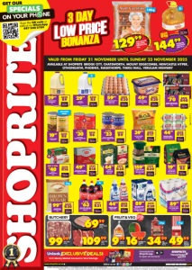 www.shoprite.co.za www.shoprite.mobi follow us on OFFERS AVAILABLE FROM FRIDAY 21 NOVEMBER 2025 UNTIL SUNDAY 23 NOVEMBER 2025 AT THESE KWAZULU NATAL SHOPRITE STORES: BRIDGE CITY, CHATSWORTH, MOUNT EDGECOMBE, NEWCASTLE HYPER, OTHONGATHI, PHOENIX, RAISETHORPE, THEKU MALL, VERULAM HIGHWAY. WHILE STOCKS LAST. WE RESERVE THE RIGHT TO LIMIT QUANTITIES. 3 DEALS PER CUSTOMER. NO TRADERS. VAT INCLUDED. ERRORS AND OMISSIONS EXCEPTED. BUTCHERY FRUIT&VEG NOODLE KING EEZEE NOODLES 5x65g per pack SAVE R5 1999 JACOBS INSTANT COFFEE JAR 200g/ DOY PACK 230g each SAVE R30 15999 VALID FROM FRIDAY 21 NOVEMBER UNTIL SUNDAY 23 NOVEMBER 2025 AVAILABLE AT SHOPRITE BRIDGE CITY, CHATSWORTH, MOUNT EDGECOMBE, NEWCASTLE HYPER, OTHONGATHI, PHOENIX, RAISETHORPE, THEKU MALL, VERULAM HIGHWAY 30s RITEBRAND/BARNEY’S LARGE EGGS 30 per tray SAVE R20 5999 10999 BEEF STEAK PACK per kg 6999 CHICKEN BREAST FILLETS per kg JACOBS CAPPUCCINO STICKS 8/10 per pack SAVE R35 4499 RAMA ORIGINAL 60% FAT SPREAD 1kg SAVE R20 4999 9999 HALF SHEEP per kg Money Market Account is a division of Shoprite Checkers (Pty) Ltd (FSP7732) with banking services provided by African Bank Limited (Reg. No. 2014/176899/06). Ts & Cs apply. moneymarketaccount.co.za Download the Shoprite app to open an account. With Money Market Account & Xtra Savings. Unlock OMO AUTO LIQUID DETERGENT 1,5l/ CAPSULES 14 per pack/ WASHING POWDER 2kg each SAVE R20 8999 BONANZA LOW PRICE 3 DAY 12999 AUNT CAROLINE LONG GRAIN PARBOILED RICE 10kg ZNFOSRDQRJ_E ESKORT FROZEN GOLD MEDAL PORK SAUSAGES 375g SAVE R40 R70 2 FOR CLOVER MEDIUM CREAM MAAS 2kg SAVE R9 2999 CLOVER FRESH MILK 2l SAVE R5 2999 RITEBRAND TOMATO & ONION MIX 410g SAVE R6 R30 2 FOR MCCAIN FROZEN MIXED VEG 1kg SAVE R17 3999 RAINBOW SIMPLY CHICKEN PREMIUM POLONY 500g each SAVE R15 4499 FIVE ROSES SMOOTH CEYLON BLEND TEA BAGS 100 per pack SAVE R18 4999 SUGARFIELDS BROWN SUGAR 5kg SAVE R20 9999 COCA-COLA ORIGINAL TASTE LESS SUGAR SOFT DRINK 2l SAVE R21 3 FOR R63 BAKERS TENNIS BISCUITS 200g SAVE R16 ANY 2 FOR R40 COMFORT FABRIC CONDITIONER 800ml each SAVE R18 4499 5kg 2l 2l SAIKAV RANGE 410g each SAVE R8 1999 10kg KITTEN SOFT MINI 2-PLY TOILET ROLLS 18 per pack SAVE R30 8999 POT O’ GOLD BAKED BEANS IN TOMATO SAUCE 410g SAVE R9 R23 2 FOR 999 CARROTS 1kg bag 1699 WATERMELON QUARTER each 3499 JAM TOMATOES 2kg bag 4999 CLASS 1 BEST BUY POTATOES 7kg pocket 2kg 7kg EXCLUDES SAMP SAVE R40 14499 RITEBRAND SUNFLOWER SEED OIL 5l 5l
