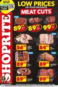 LOW PRICES MEAT CUTS ON YOUR FAVOURITE ZNFOSRDUXR/E OFFERS AVAILABLE FROM WEDNESDAY 25 MARCH 2026 UNTIL SUNDAY 5 APRIL 2026. AVAILABLE AT ALL KWAZULU-NATAL SHOPRITE STORES. WHILE STOCKS LAST. WE RESERVE THE RIGHT TO LIMIT QUANTITIES. 3 DEALS PER CUSTOMER. NO TRADERS. VAT INCLUDED. ERRORS AND OMISSIONS EXCEPTED. CUSTOMER CARE LINE 0800 01 07 09 (TOLL-FREE). 8990 BEEF POTJIEKOS LOOSE SERVE per kg SELECTED STORES 8999 PORK TEXAN STEAK per kg 9999 BULK BEEF BRISKET per kg SELECTED STORES SELECTED STORES 5690 CHICKEN LEG QUARTERS LOOSE SERVE per kg 8999 PORK BRAAI BOX per kg 8990 KAROO WORS LOOSE SERVE per kg 9999 BULK BEEF MINCE per kg 8999 PRE-COOKED PORK SHOULDER RIBS per kg 8499 BULK PORK PACK per kg SELECTED STORES OFFERS VALID FROM 25 MARCH 2026 UNTIL 5 APRIL 2026
